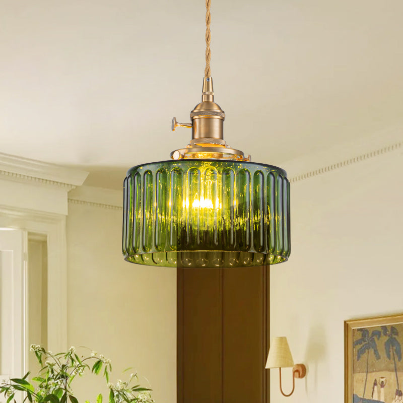 Vintage Minimalist 1-Light Strip Patterned Glass Drum Round Pendant Light