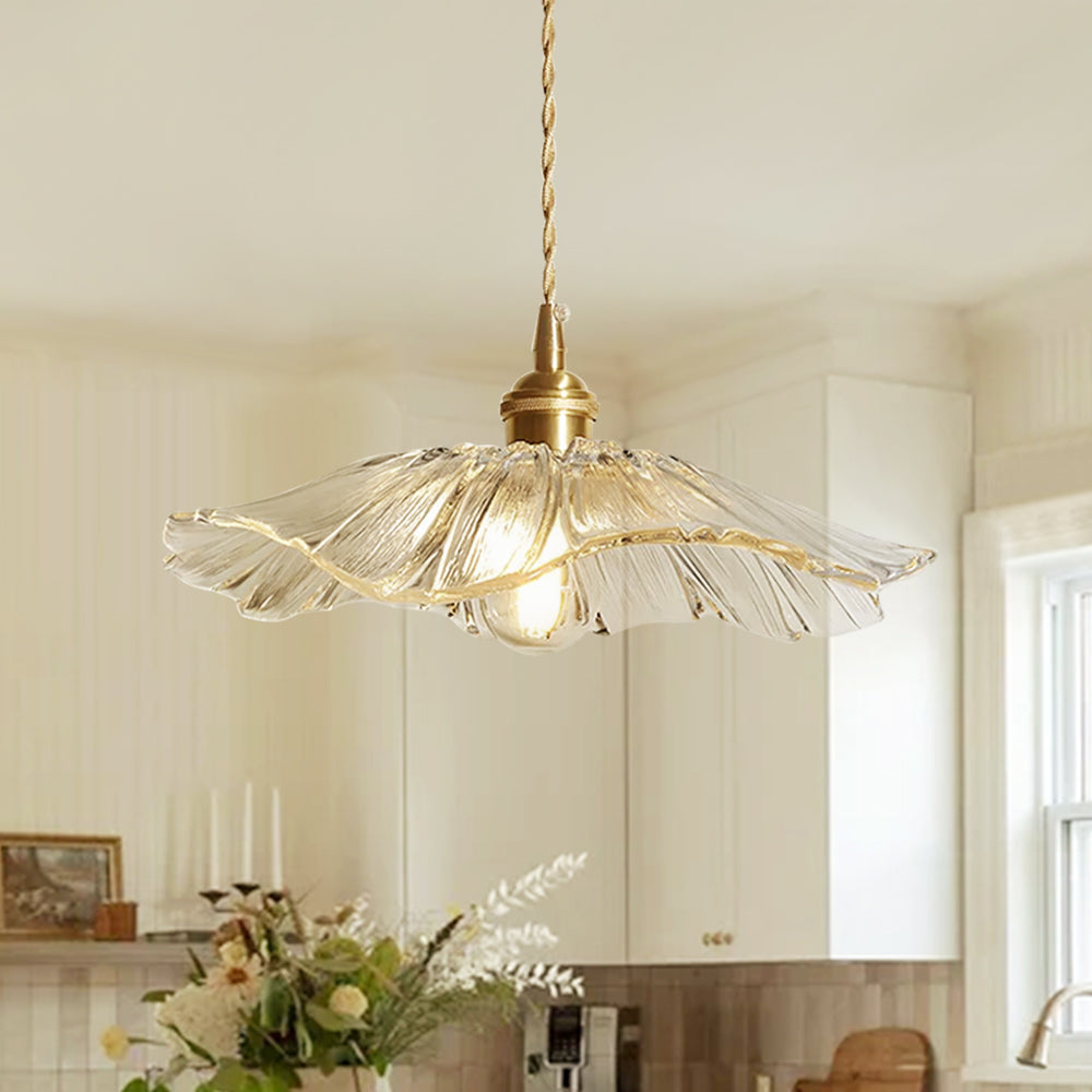Vintage 1-Light Wrinkle Cone Shape Scalloped Glass Shade Pendant Light