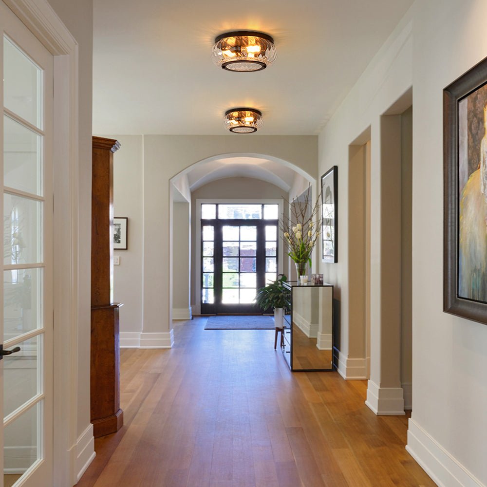 Where rustic charm meets modern elegance. Discover the perfect balance with our round water pattern shade bowl flush mount. It features a unique clear glass bowl with a textured "water-rippled" pattern that softly diffuses light, creating a warm and inviting glow. The open-bottom design ensures ample downward illumination, while its low-profile silhouette is perfect for rooms with lower ceilings. A versatile and stylish lighting solution for any space.